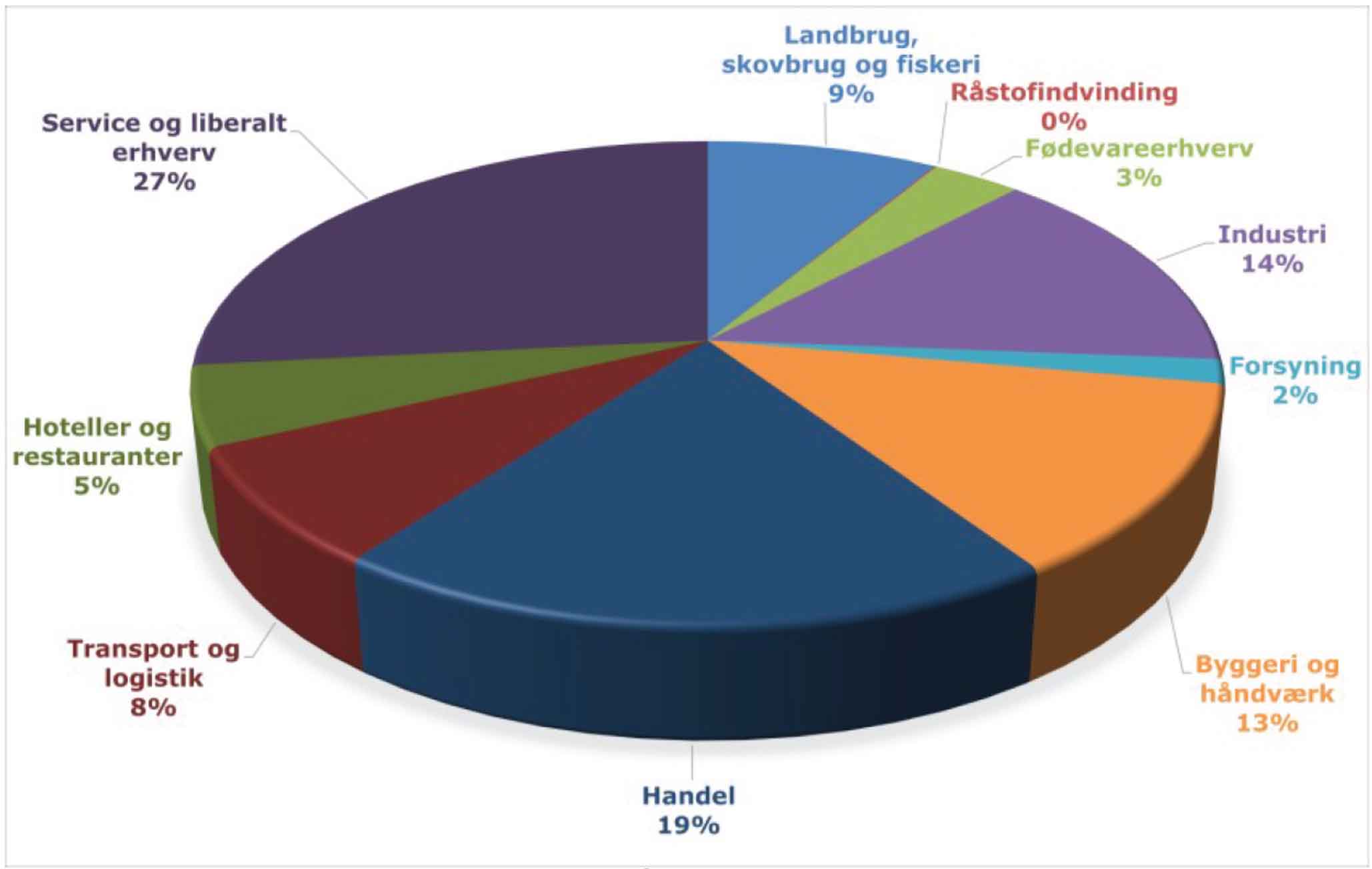 Fordelingen af arbejdspladser på forskellige brancher kan ses i en grafik fra rapporten, gengivet herunder. Vi mener rapporten er fra 2024.