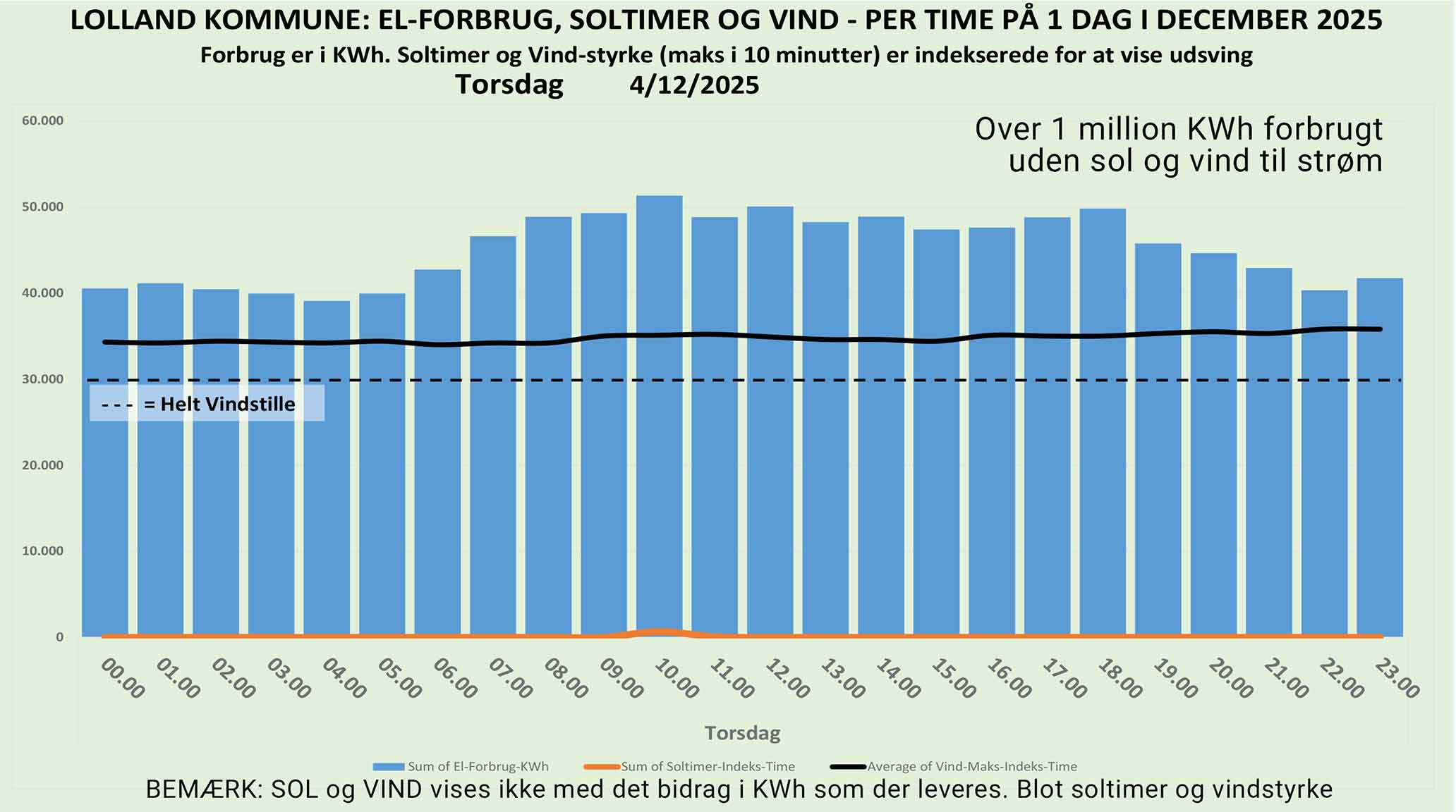 Og tager vi en enkelt dag, f. eks. torsdag 4. december 2025, ses et forbrug på over 1 million KWh på 24 timer – uden hverken sol eller vind til at producere strøm. Hvor den så kom fra, er ukendt, men 58% var fra Vedvarende Energi kilder den dag.