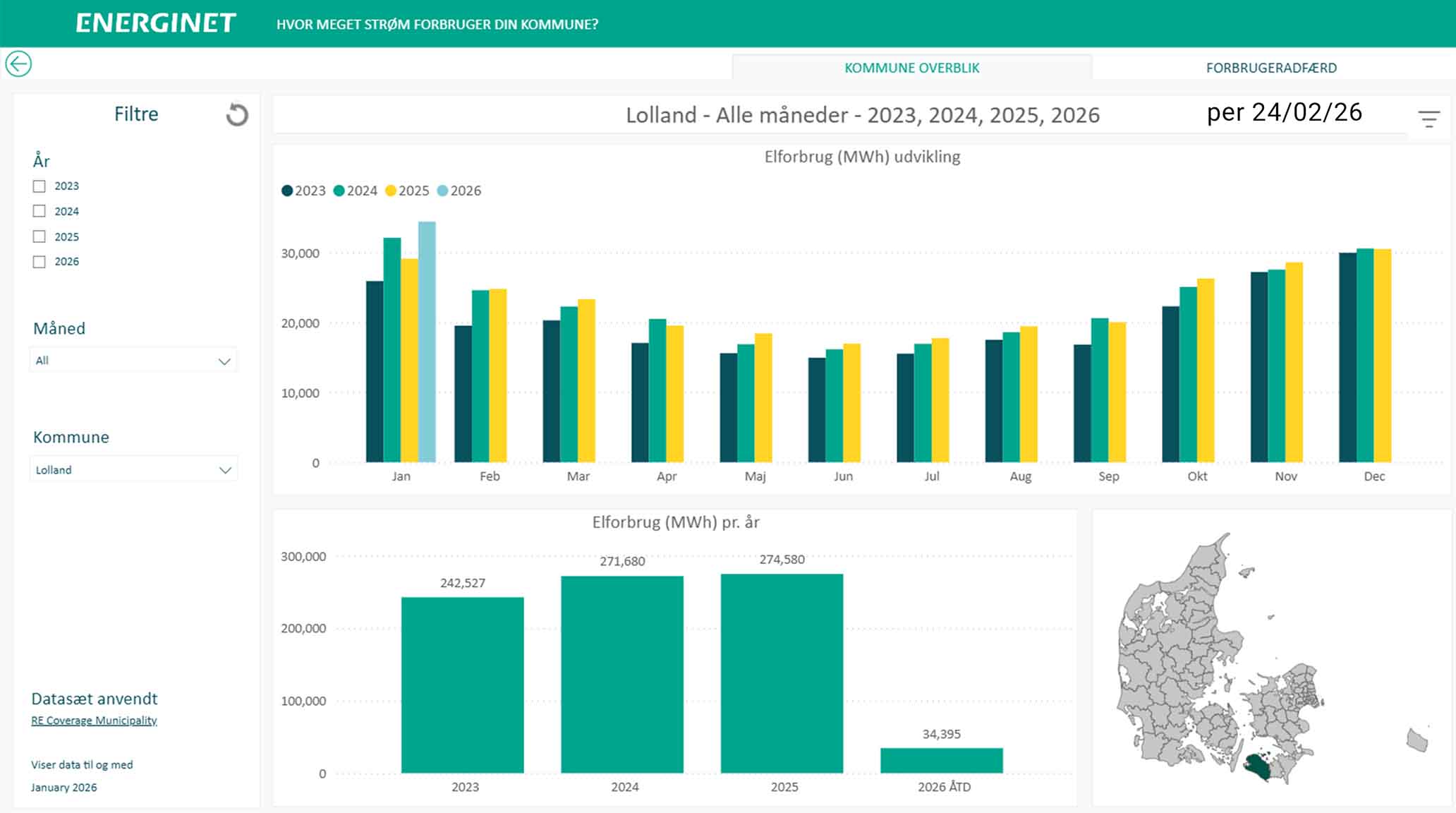 Forbruget er stigende, over 13% fra 2023 til 2025, men stadig højest i vintermånederne. Vi trak data for Lolland Kommune (Municipality number = 360) fra Energinet / Energidataservice: